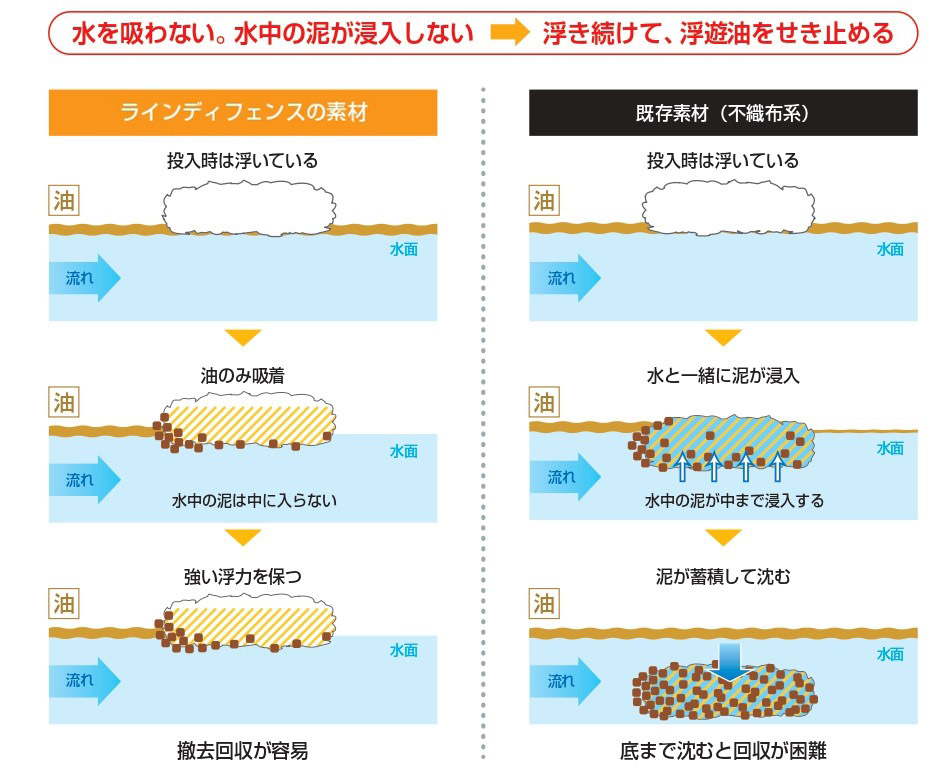 ●長期間水面に浮くので、補助的なオイルフェンスとして性能を確保。水分を吸って水没しないので、取り換えの手間が少ない。