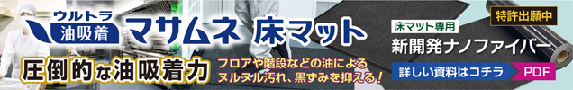 「ウルトラ油吸着マサムネ床マット」飲食店や工場などの滑りやすい床において、靴裏についた油を強力吸着!多くの飲食店様でトライアルを実施し好評価を得ています。